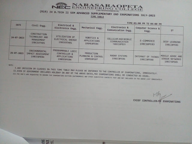 NEC B.Tech 4-2 R19 Advance Supply Exam Timetables July 2023 is now available and the exams are held on 24th and 26th July 2023. The following is the official schedule